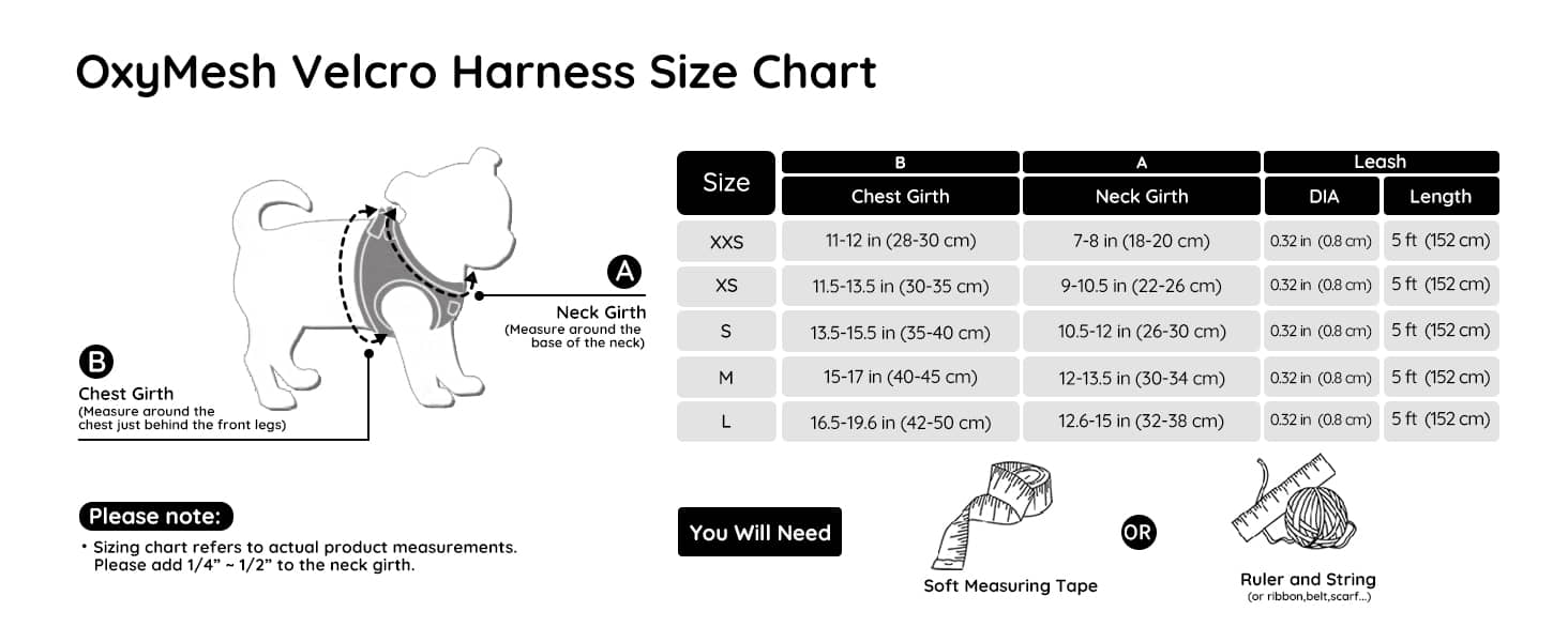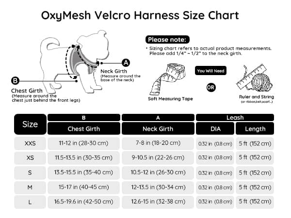 We recommend measuring your pet’s chest girth (right behind the front legs) and neck circumference, then checking our size chart. If your pet is between sizes, go for the larger one for comfort.